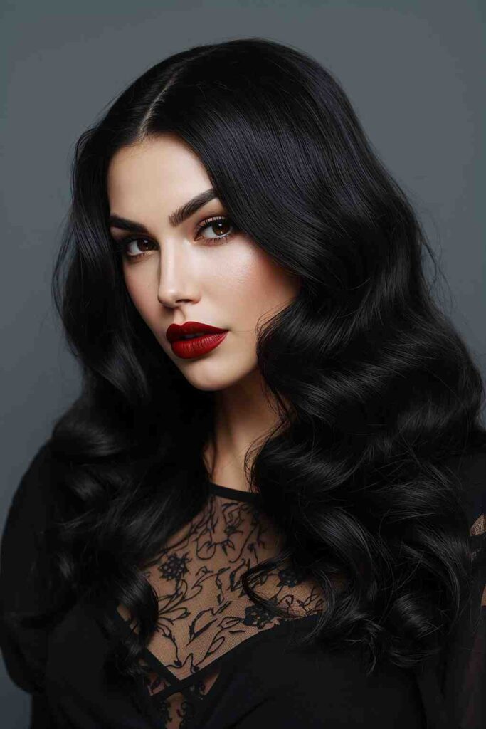 These glossy, voluminous waves scream Halloween glam. Inspired by old-Hollywood vampires, they pair beautifully with gothic makeup and dark lips. Perfect for vampire, witch, or glam devil costumes.
