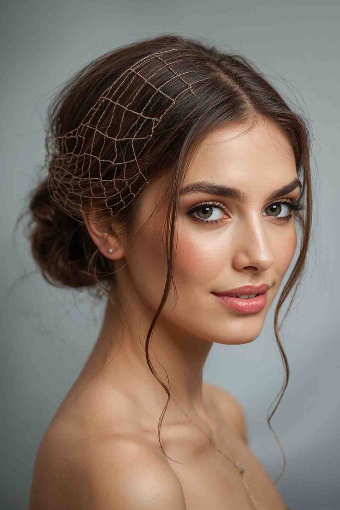 Style Suggestion: Secure the half-up section tightly and weave thin white ribbons for the web effect.