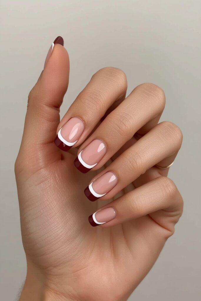 Burgundy French Tips bring rich, deep color to the classic manicure. The luxurious shade gives your nails a warm, sophisticated winter feel. Burgundy pairs beautifully with gold, black, cream, and jewel tones, making it ideal for seasonal outfits. It’s perfect for anyone who loves classy, dark colors during winter.