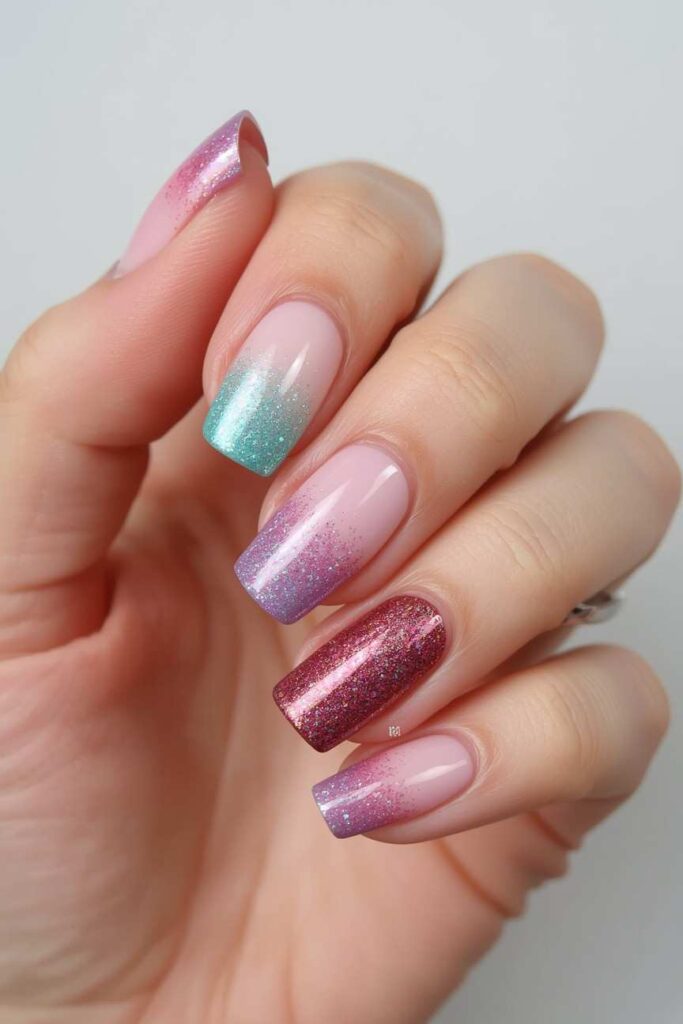 Glitter Ombre French Tips offer a seamless transition from a clear or nude base to richly sparkling tips. This soft yet shimmering effect gives your nails both elegance and festive personality. It’s a wonderful option for anyone who loves glitter but prefers a clean, blended finish. The ombré style suits all nail shapes and lengths beautifully.