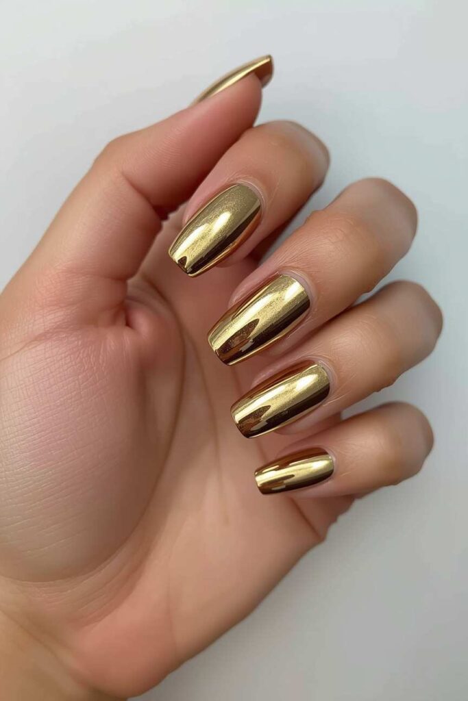 Gold Chrome French Tips provide a rich metallic glow perfect for glamorous winter events. The reflective chrome finish elevates the traditional French manicure into a bold holiday statement. Whether you’re dressing up for a Christmas gala or a New Year’s celebration, this design adds instant luxury to your look.