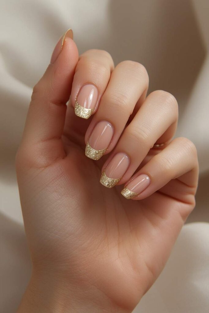 Whether the gold glitter is subtle or densely packed, the result is always glamorous. The combination of a clean base and rich glitter ensures a balanced, sophisticated finish ideal for December celebrations.