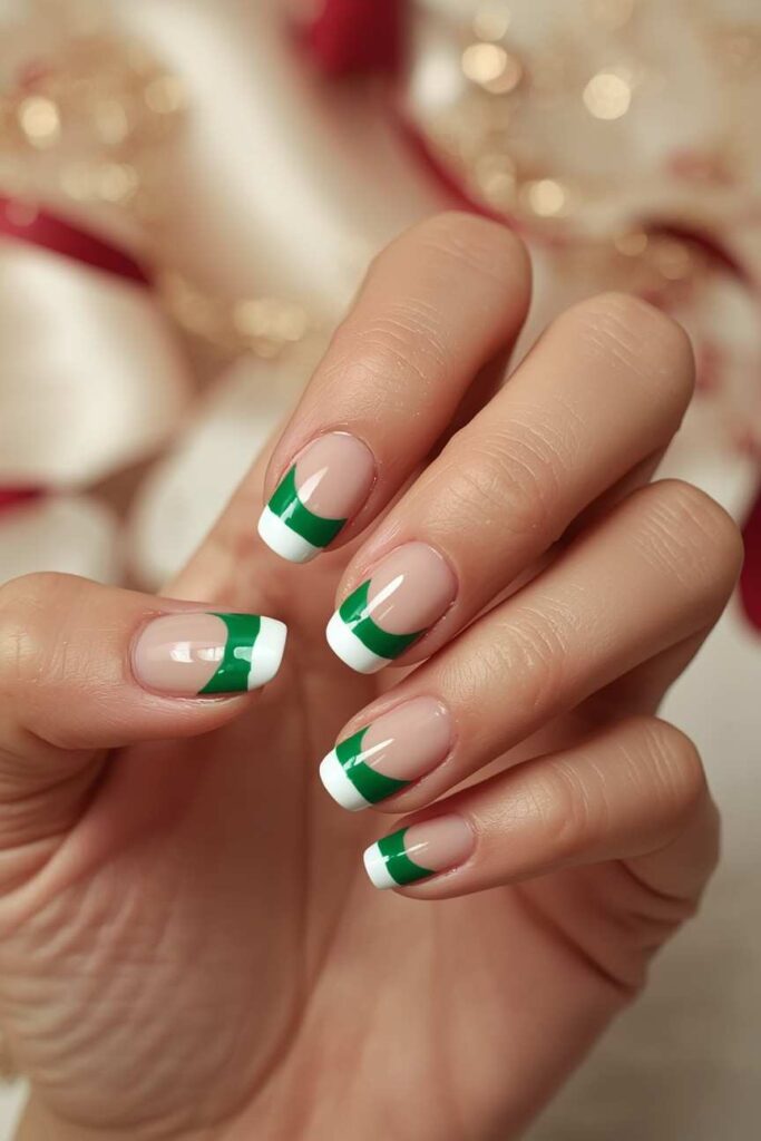 The clean nude base keeps the look sophisticated, while the green tips add that cheerful seasonal touch. It’s a beautiful choice for anyone wanting something festive yet understated, and it pairs wonderfully with cozy winter outfits.