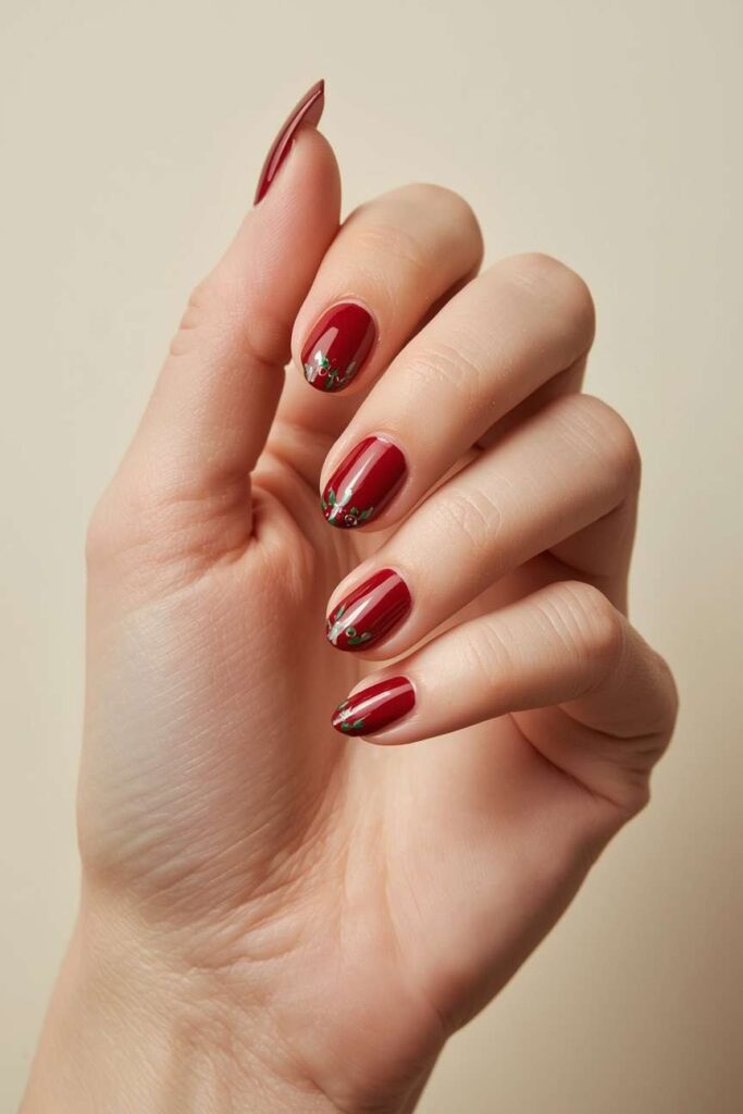 Whether you have short, square nails or long almond shapes, the look remains flawless and versatile. Perfect for everyday wear or holiday gatherings, this design gives your nails subtle elegance with unmistakable seasonal flair.