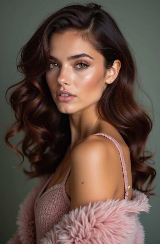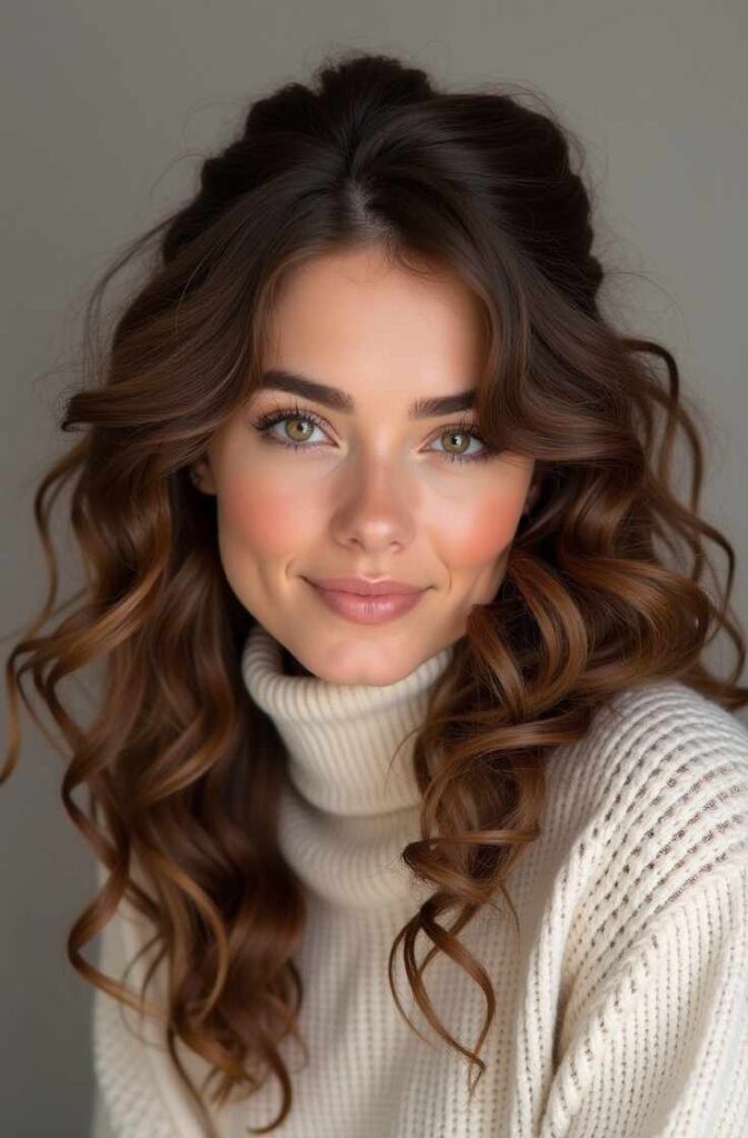 The curls remain loose and natural-looking but have a radiant, silky finish that pairs beautifully with winter fashion. This hairstyle is ideal for anyone wanting a soft glow that brightens their winter complexion and elevates their overall seasonal look.