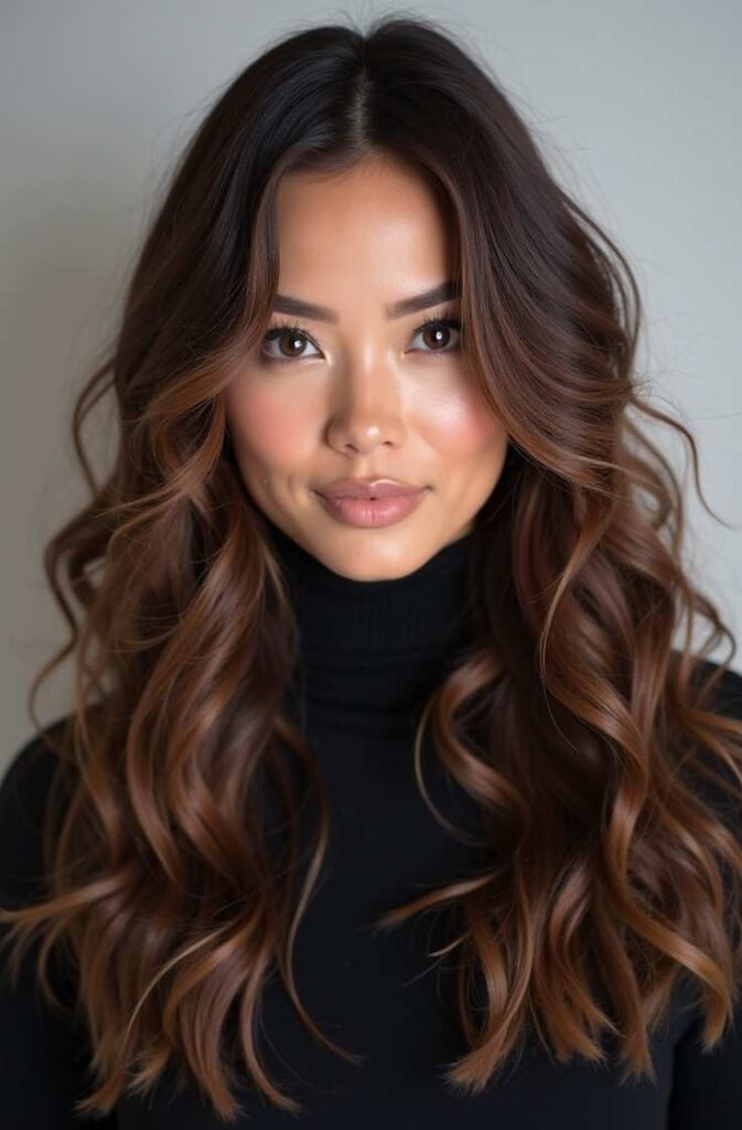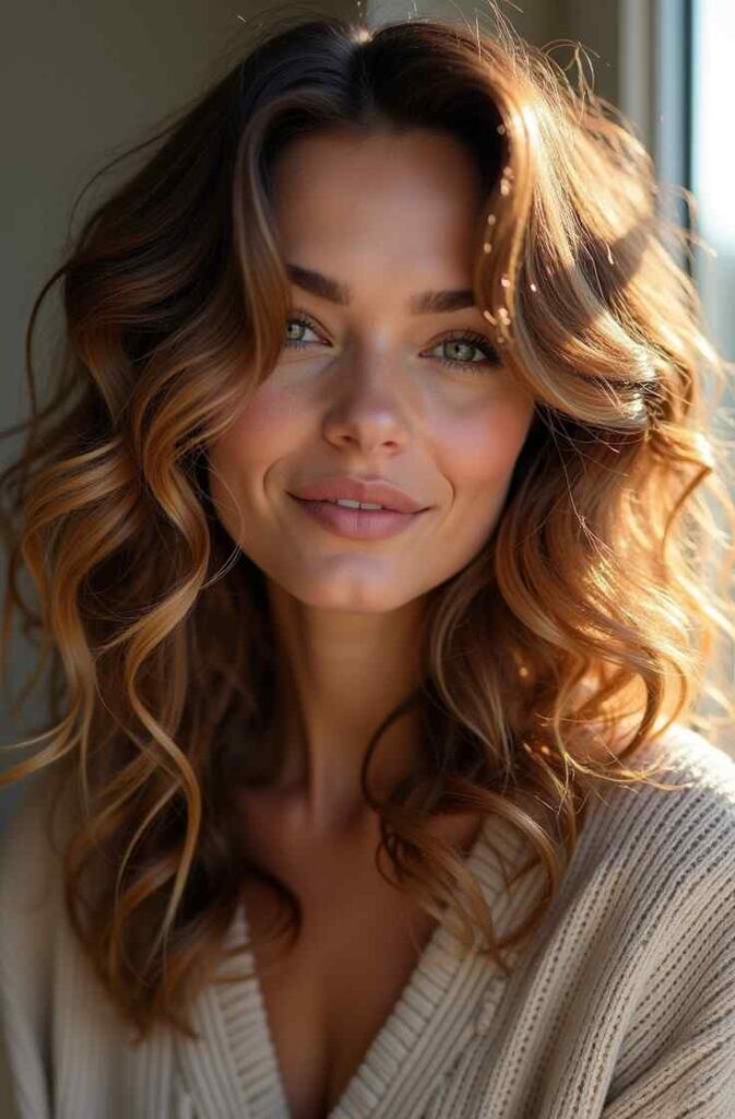 Honey-toned loose curls bring warmth and radiance to winter styling. The golden undertones complement the season’s cool lighting and enhance your natural glow. Honey curls look soft, warm, and inviting, perfect for anyone wanting a color and style that brightens winter days. This look pairs beautifully with layered outfits, cozy knits, and seasonal makeup trends.