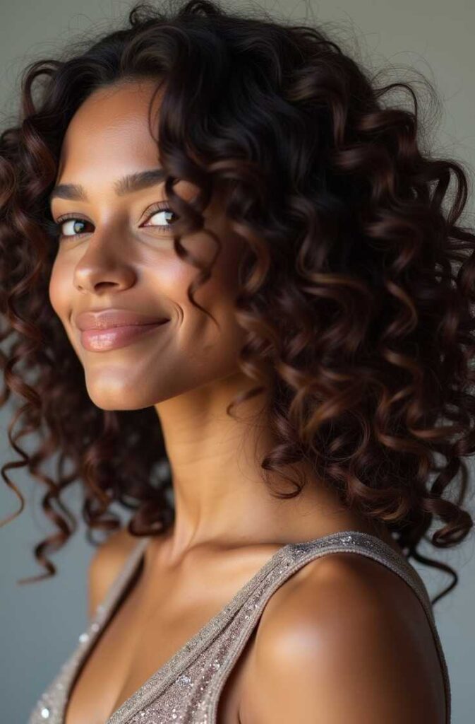 Loose layered curls add movement, dimension, and volume—making them an ideal winter hairstyle. Layers help the curls bounce naturally, preventing the hair from appearing weighed down by hats, scarves, or winter dryness. This look softens the face and enhances shine by distributing curls at different lengths.