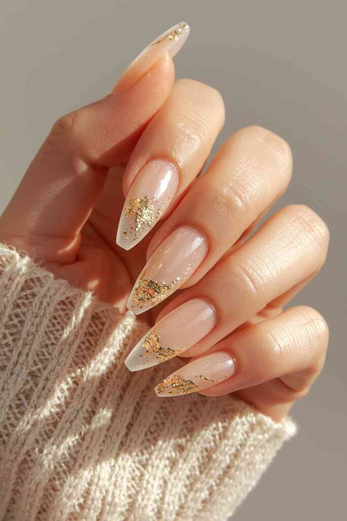 Clear nails with gold foil flakes are one of the most popular minimal holiday designs because they offer sparkle without heaviness. The transparent base keeps the look airy and modern, while the gold flakes add scattered festive shine.