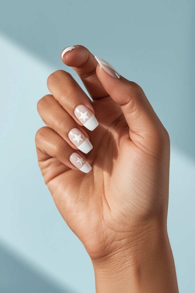 Clear nails with clean white tips and one small star accent create the perfect minimal holiday manicure. The look is fresh and airy, with the thin white tips adding structure and the lone star bringing a touch of Christmas sparkle.