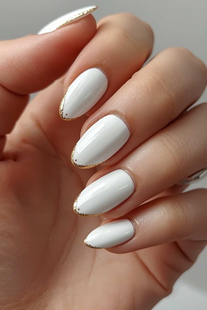 Milky white nails paired with tiny gold cuticle accents bring luxurious minimalism to your holiday look. The milky base creates a soft, pure canvas, while the gold details at the cuticle add a gentle glow that feels festive without being flashy.