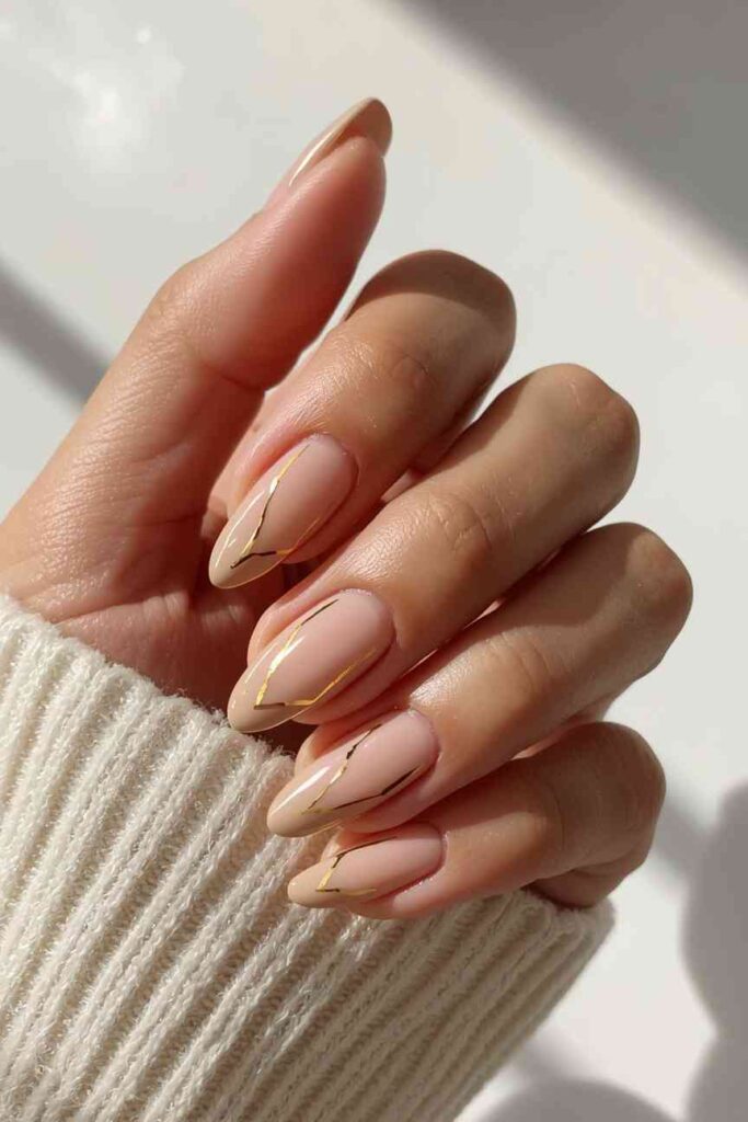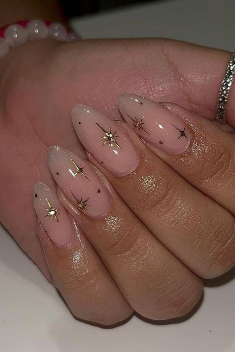 Soft nude nails with tiny gold stars create a beautifully subtle holiday aesthetic that’s both elegant and modern. The nude base provides a clean canvas, while the miniature gold stars add a delicate festive sparkle without overwhelming the design.