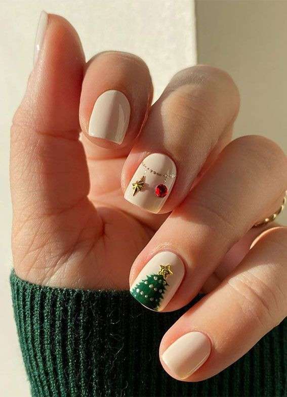 Minimal nude Christmas tree nails use small, geometric tree shapes to create a cute yet understated holiday design. The soft nude base keeps everything natural and clean, while the tiny white or gold triangle-shaped trees add charm without being overly decorative.