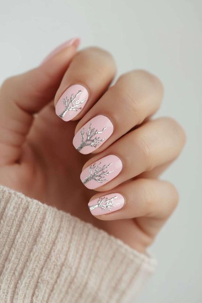 Soft pink neutral nails with tiny silver Christmas tree accents offer a delicate and elegant take on holiday minimalism. The barely-there pink base feels clean and feminine, while the miniature silver trees add a festive hint without overpowering the look.