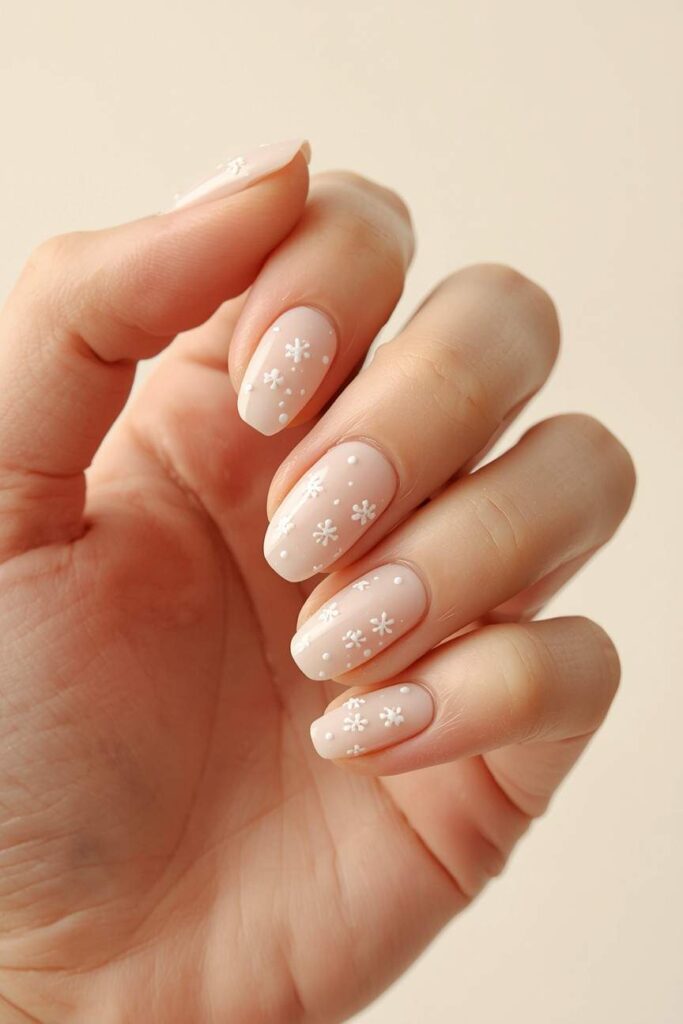Milky nails with tiny white snow dots create a soft, snowy effect that feels peaceful and delicate. The sheer milky base gives a clean, fresh appearance, while the micro-dots resemble falling snow.