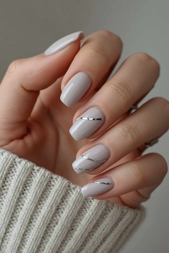 Soft grey nails paired with tiny silver accents offer a frosty minimal look inspired by chilly winter mornings. The muted grey base keeps the design calm and refined, while the silver dots or tiny foil strips evoke a wintry shimmer.