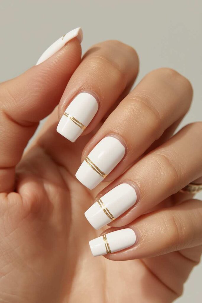 White nails with thin gold stripes create the perfect minimal holiday manicure. The crisp white base feels fresh and snowy, while the slim gold lines add subtle festive sophistication.