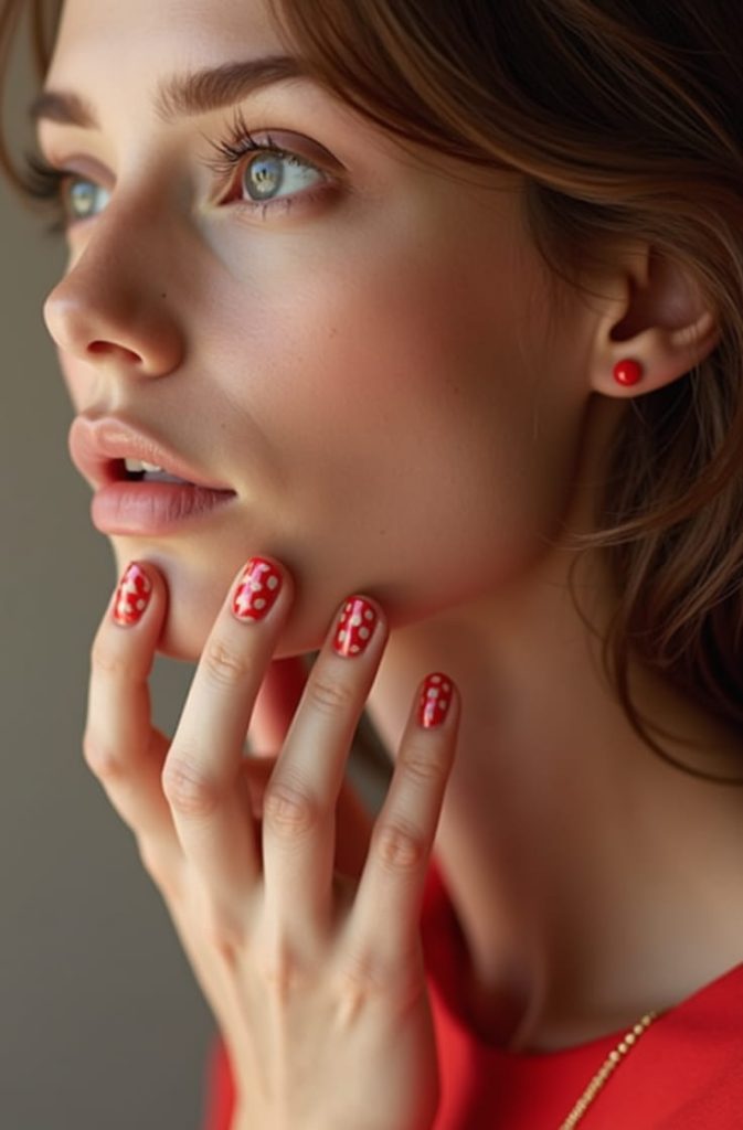 Introduction: Red polka dots on a nude base are minimal yet festive. This playful design works well for short nails and adds personality without being bold or complicated.