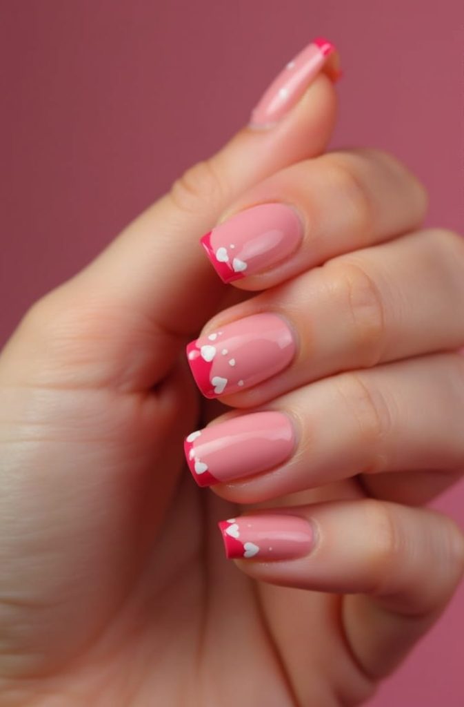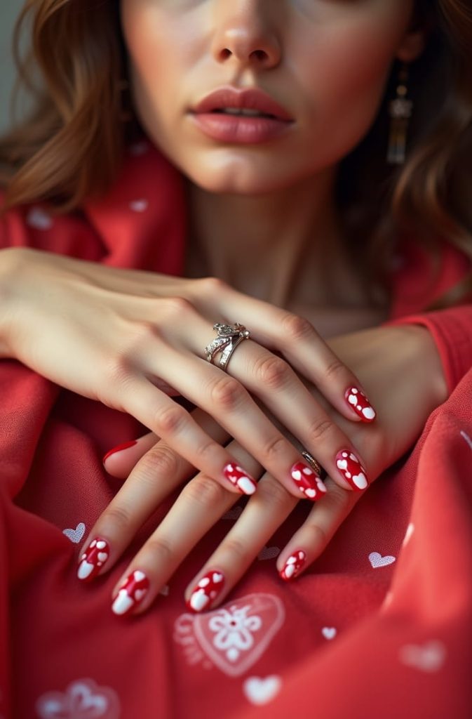 Introduction: Tiny white heart-shaped polka dots on a nude base create a minimalistic, playful Valentine’s vibe. It’s perfect for short nails that need understated charm.