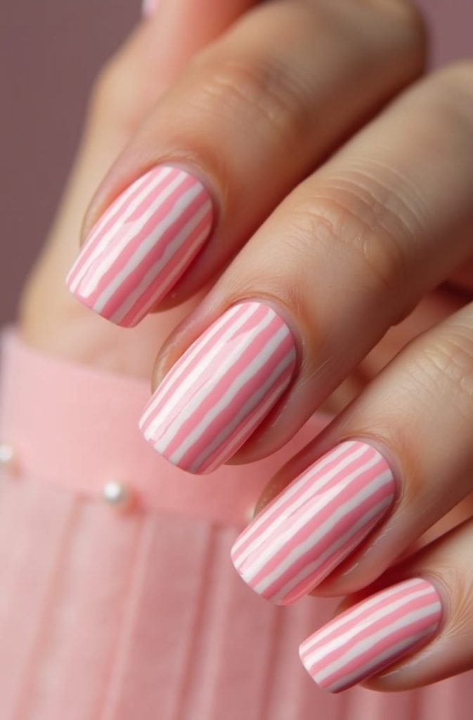 Introduction: Soft pink and white stripes create a subtle, playful Valentine’s Day look. This minimalist design works perfectly on short nails, offering charm without complexity.