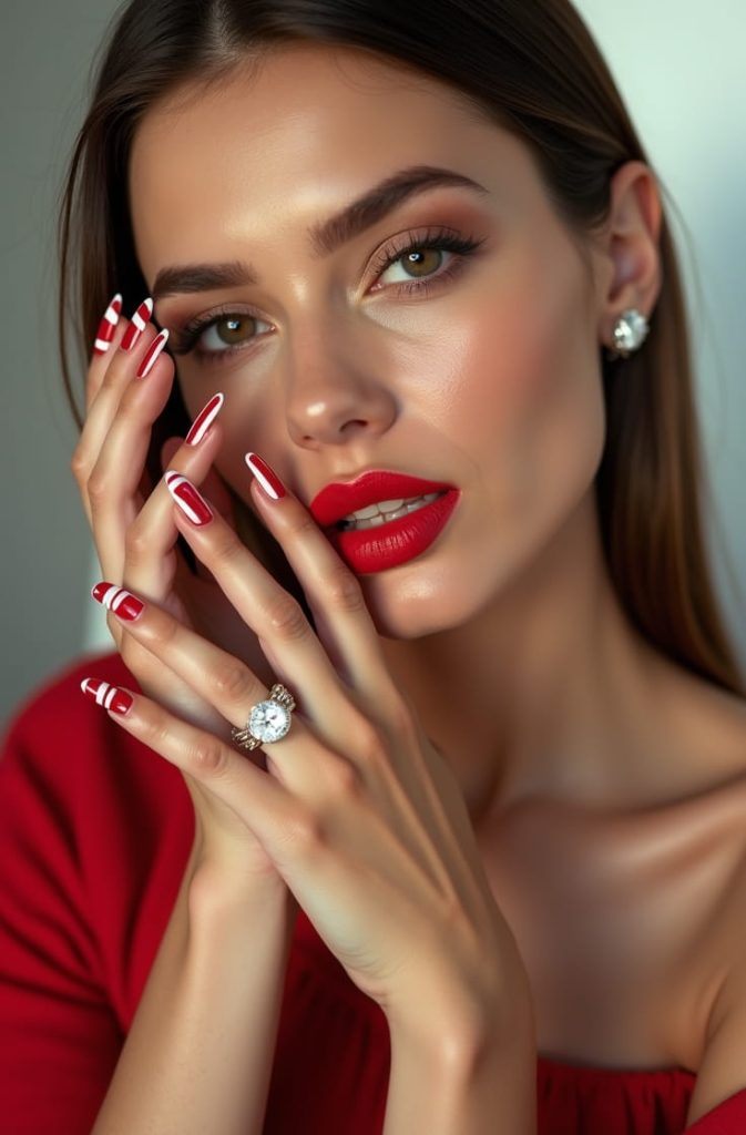 Introduction: A single vertical red stripe on nude or pale pink nails is sleek and minimal. It’s a subtle way to incorporate Valentine’s colors without full coverage.