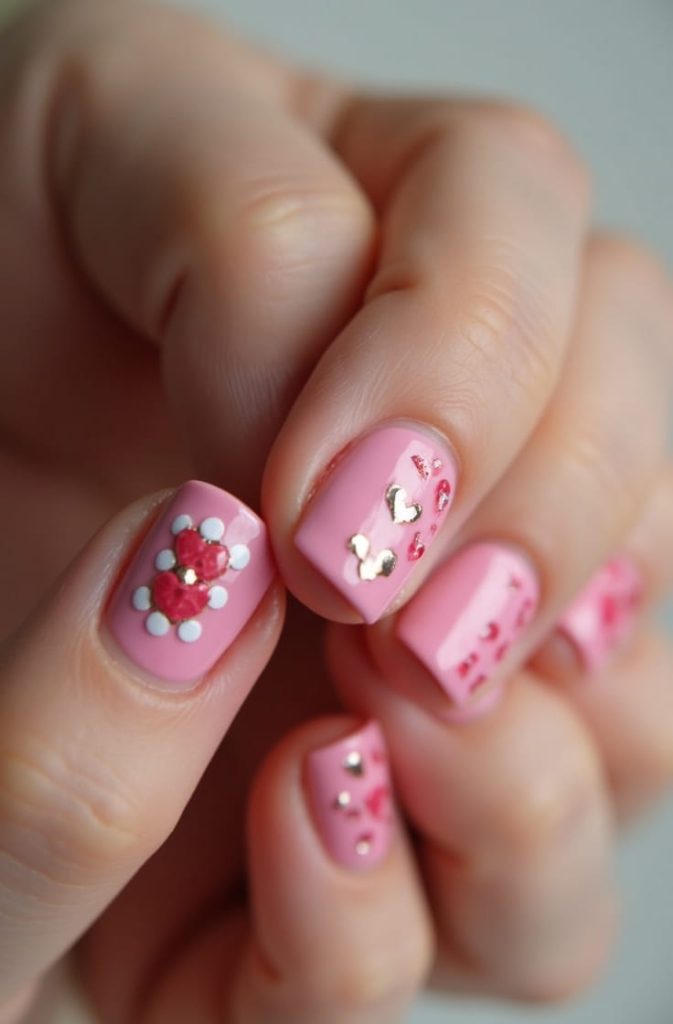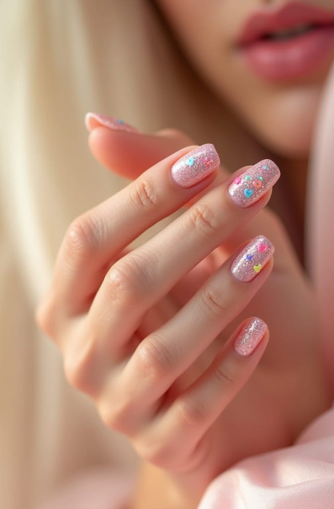 Introduction: Small glitter hearts on nude or soft pink nails add sparkle and romance in a minimalistic way. Perfect for short nails, it combines elegance with subtle festivity.