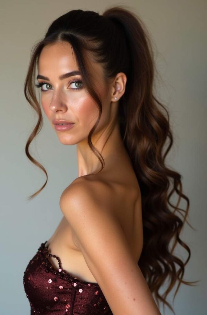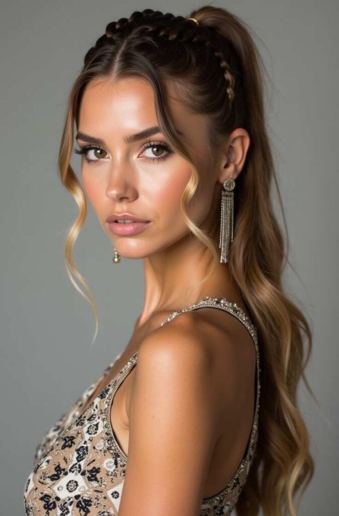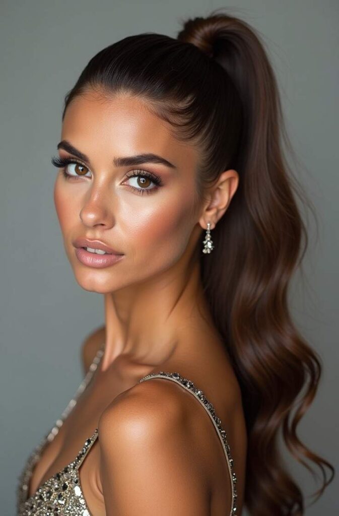 This look works well with glittery dresses or elegant jumpsuits. You must try this style if you want a ponytail that adds height and drama without looking messy. It’s perfect for formal parties, giving a retro-modern glam vibe while remaining sleek and chic.