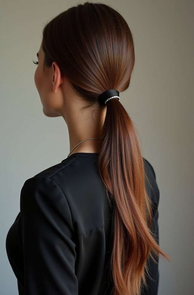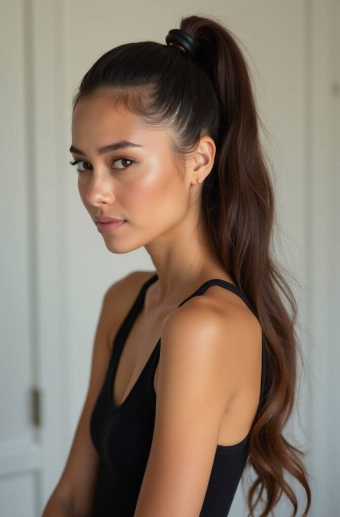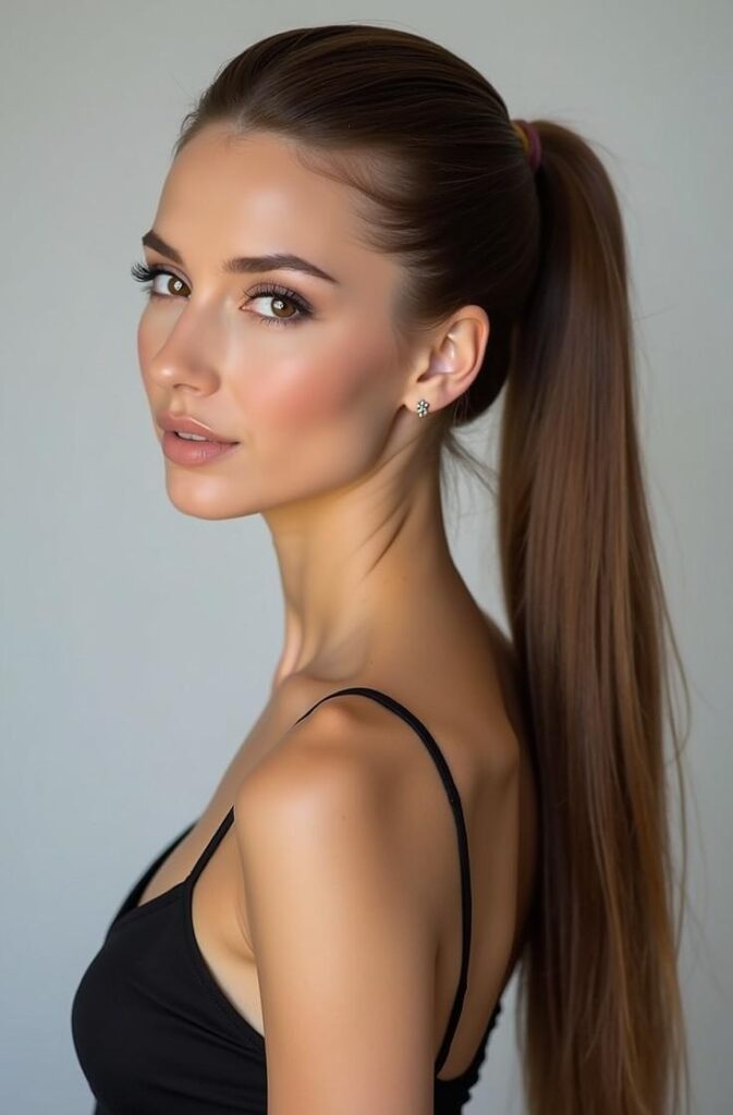 The high sleek ponytail is a timeless, chic style that elongates the neck and highlights your facial features. To achieve this look, smooth hair with a shine serum, pull it tightly to the crown, and secure with a strong elastic.