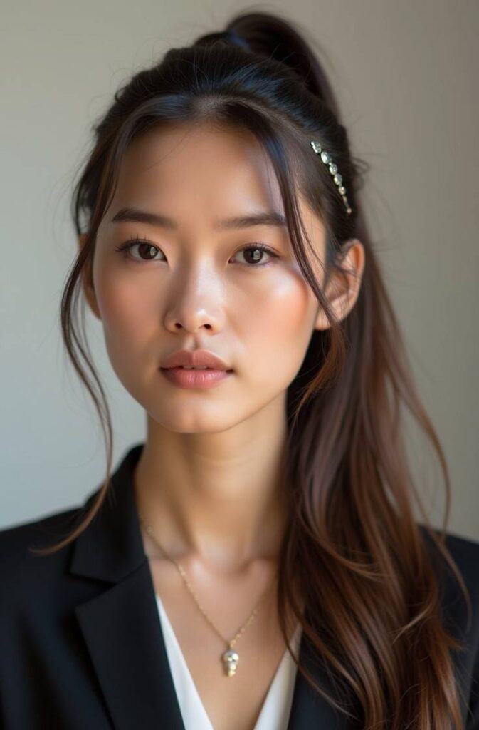 It’s perfect for refined New Year celebrations or dinners where elegance and minimalism are key. The low ponytail provides a sleek, professional, and polished aesthetic while remaining trendy and wearable.