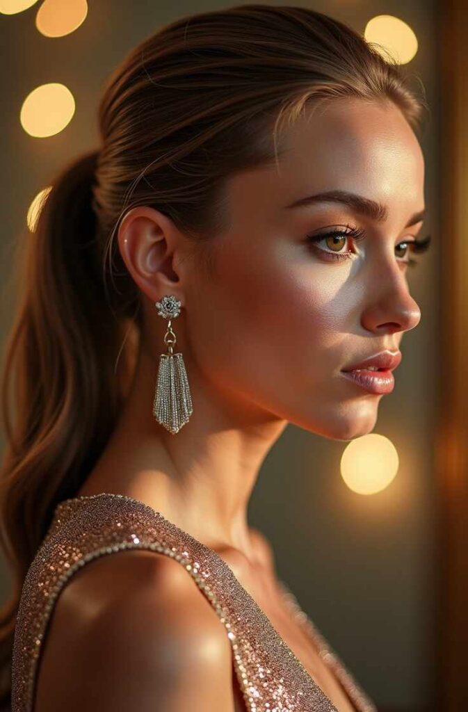 It’s flirty, glamorous, and perfect for New Year parties where you want a mix of elegance and fun. The sleek side ponytail keeps your look modern while maintaining effortless sophistication.