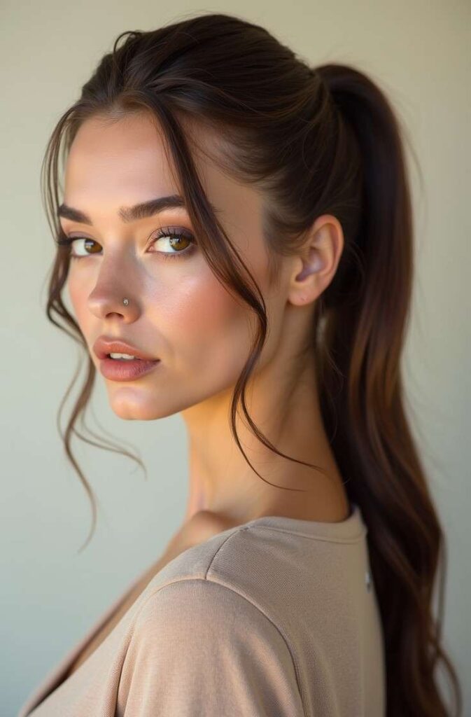 This style complements asymmetrical dresses, off-shoulder tops, or bold statement jewelry. You must try this ponytail if you want a striking, fashion-forward hairstyle that makes a statement without looking overdone.