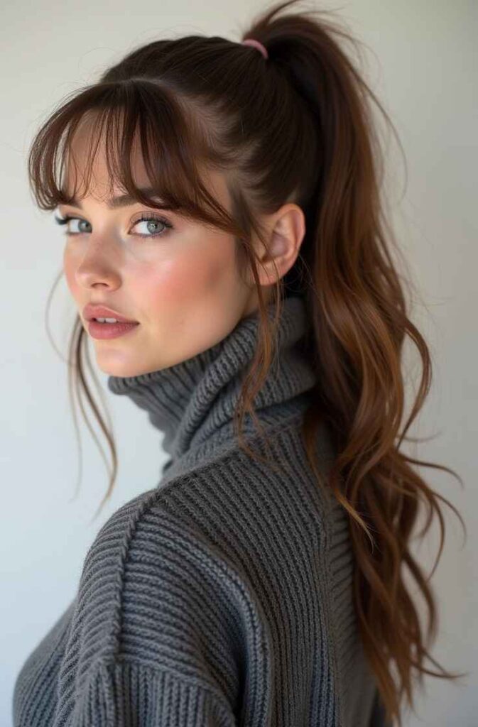 This winter-friendly ponytail keeps the sleek base but leaves loose, soft strands around the face for a gentle, romantic touch. Perfect for soft glam winter looks, this hairstyle creates balance between structure and movement. It pairs nicely with cozy sweaters, scarves, and winter jackets without losing its polished appeal.