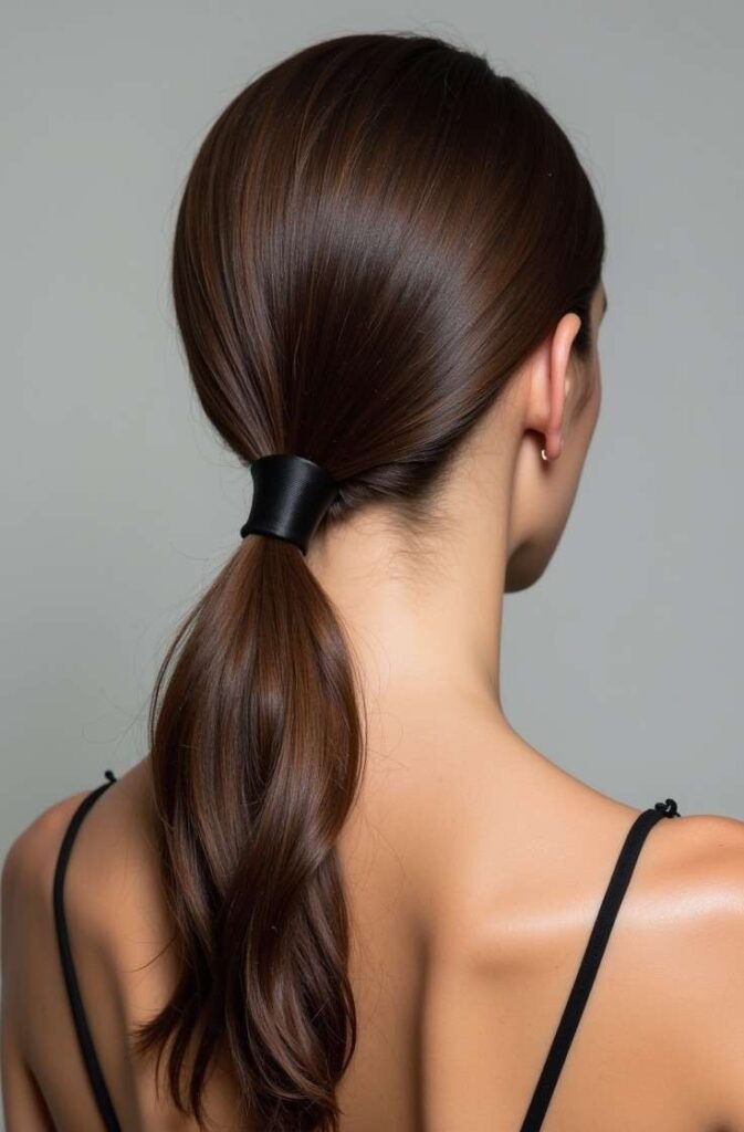 Create a sharp middle part, smooth the hair with serum, and secure the pony at mid-height or low.