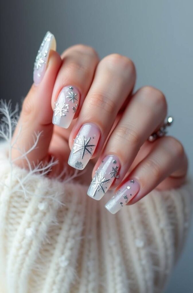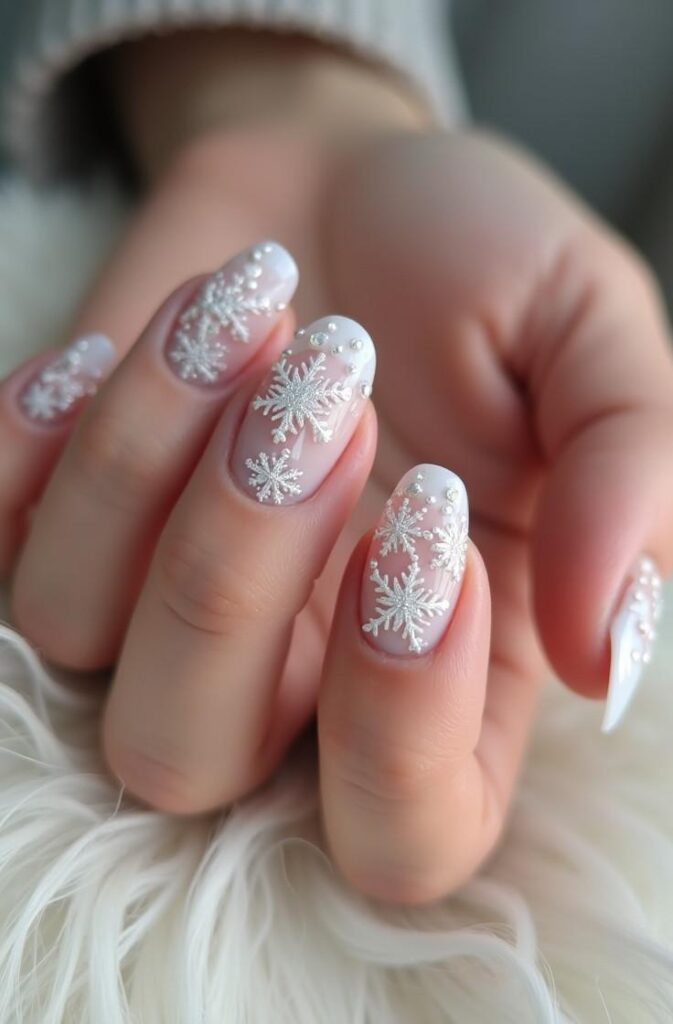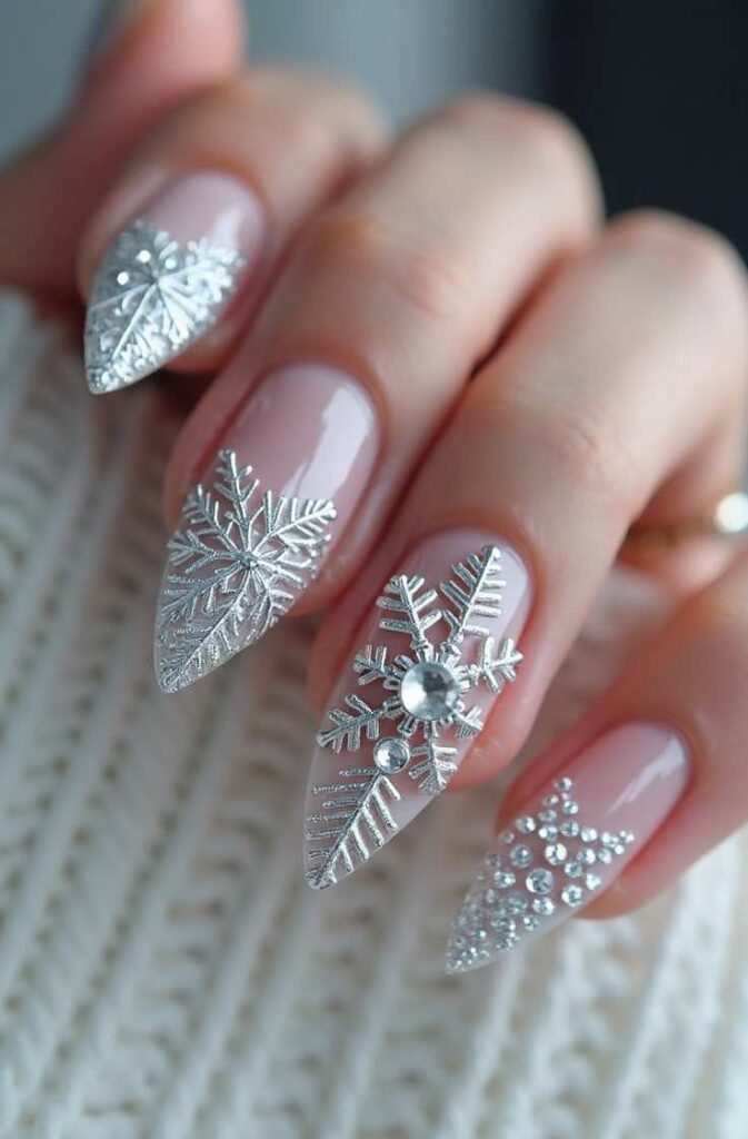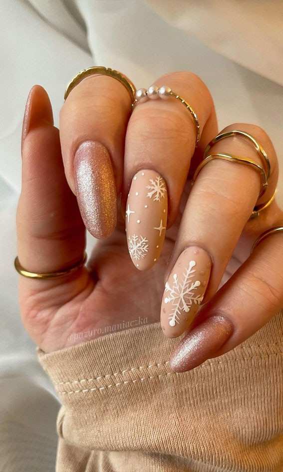 Pairing a taupe, nude, or sheer base with delicate white or metallic snowflakes creates a polished, understated style. This design is perfect for work, school, or daily winter wear while still adding seasonal charm.