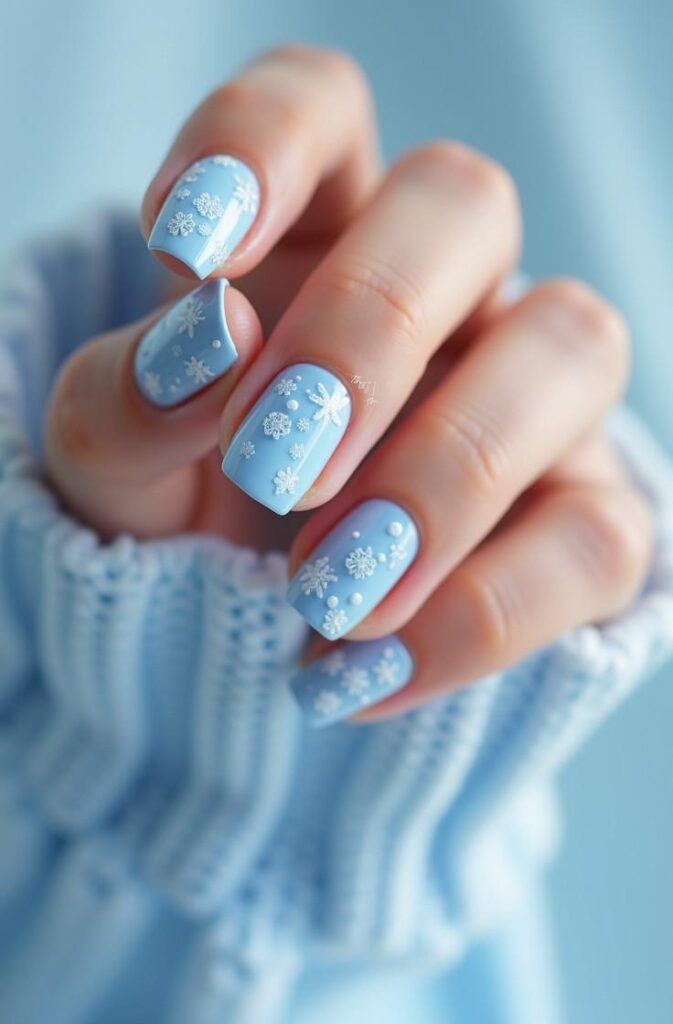 10. Baby Blue Snowflake Nails