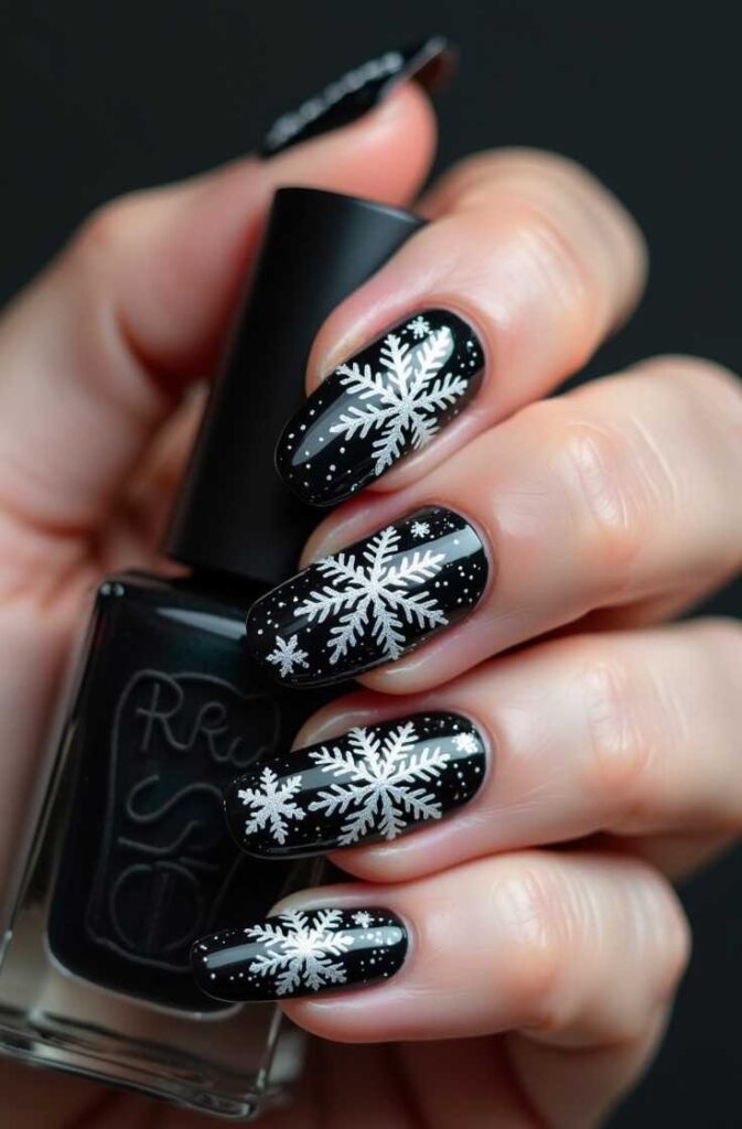 Whether matte or glossy, the black base adds depth and intensity, allowing snowflakes to pop dramatically. This look is perfect for those who love unique, non-traditional winter vibes and want to stand out with a chic, high-contrast style. It works well for evening events, winter streetwear, or simply expressing a bold aesthetic.