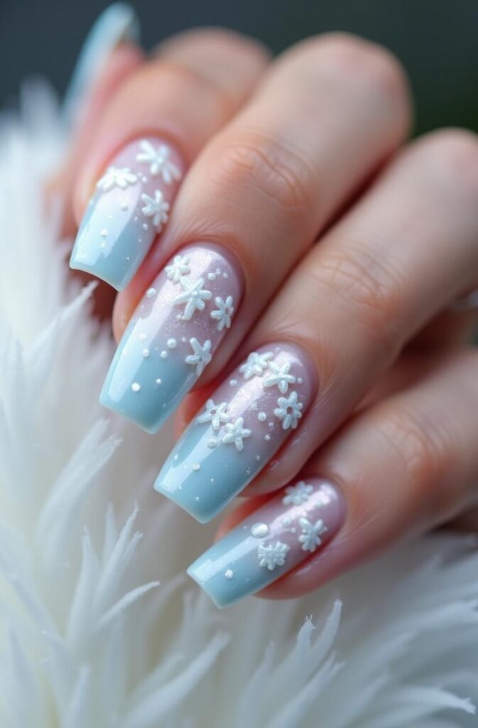 Ombre nails are versatile and give a beautifully blended effect that feels chic and modern. Combined with snowflakes, they create a winter fairytale vibe that feels ethereal yet wearable.