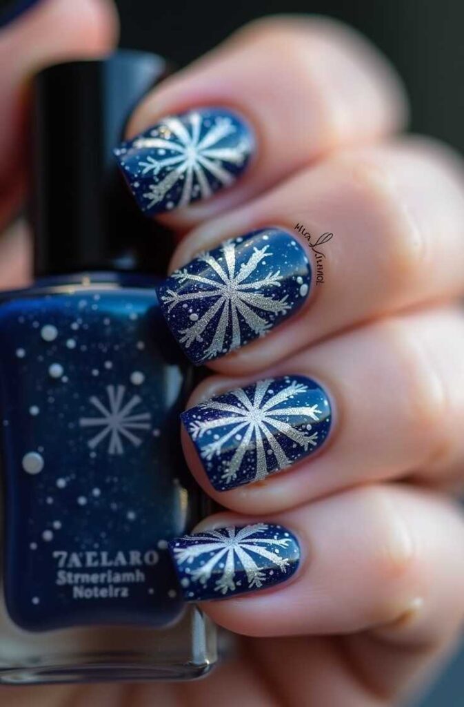 4. Navy Blue & Silver Snowflake Nails