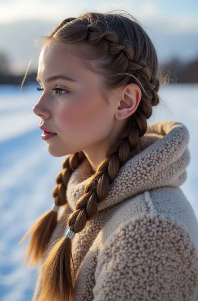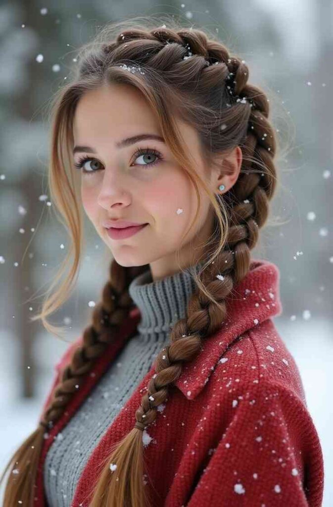 Whether worn as a single braid or in double-braid style, the Dutch braid offers a youthful, playful, and modern winter vibe. It’s a great choice if you want a visually striking hairstyle that stays neat and stylish throughout the day.