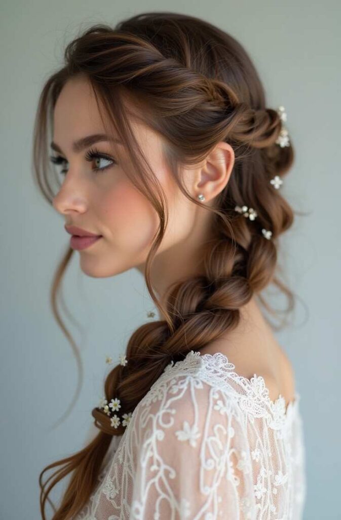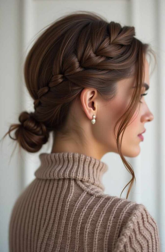 Because it rests on one side, it stays comfortable even under scarves or coats. The side braid also frames your features beautifully, adding a delicate winter flair without looking too structured or formal.