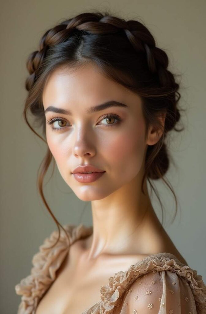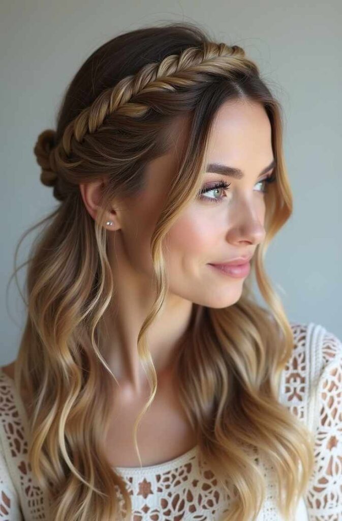 The Half-Up Braided Crown is the perfect winter hairstyle for those who want the elegance of a crown braid without fully pulling the hair up. This style blends romance and practicality, giving your winter look a soft, feminine touch while keeping your front strands neatly secured.