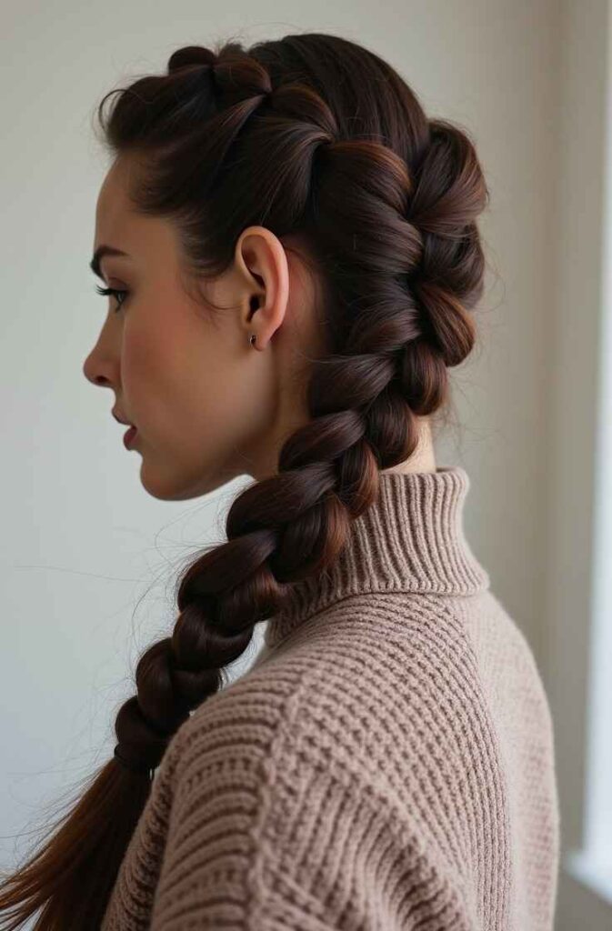 This braid works beautifully on long or medium hair and suits both casual winter outfits and more refined seasonal looks. Its smooth finish and simplicity make it an everyday winter favorite that is both practical and stylish.