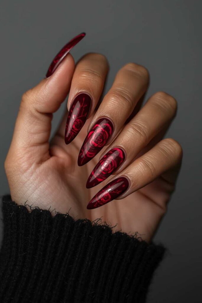 Combine romance and horror with dark rose designs over a nude or black base. Use crimson hues to create delicate rose petals, symbolizing beauty and danger. This design captures gothic allure, balancing passion and eeriness for a look that’s hauntingly captivating.
