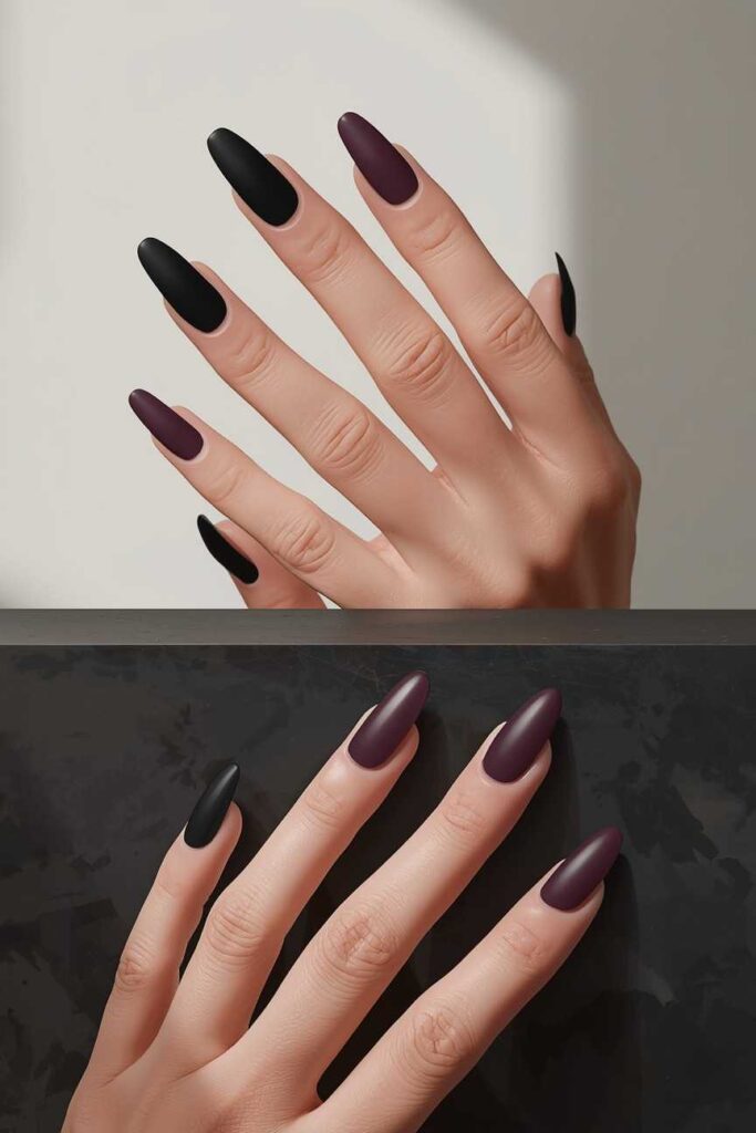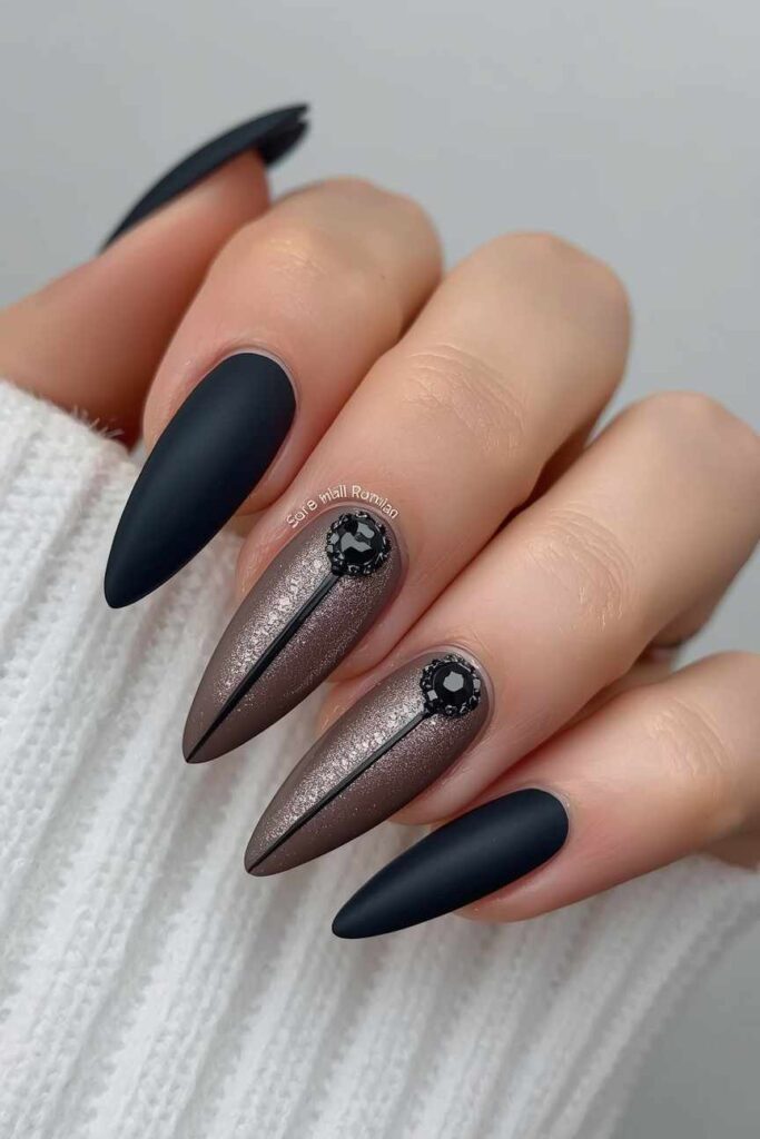 Add subtle sparkle by applying black or silver crystals on matte nails. Focus the gems near the cuticle or along the tips for an elegant balance. The contrast between shimmer and matte finishes creates a luxurious aesthetic — mysterious, regal, and irresistibly stylish for Halloween.