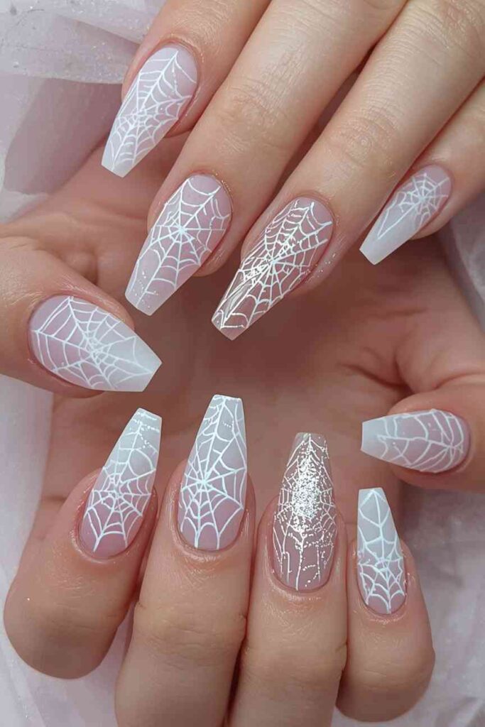 Reimagine spiderwebs with a frosted or translucent base. Use fine white or silver polish to create icy web details that look delicate and refined. This ethereal twist feels wintry yet perfectly Halloween-appropriate — hauntingly pretty, understated, and totally unique.