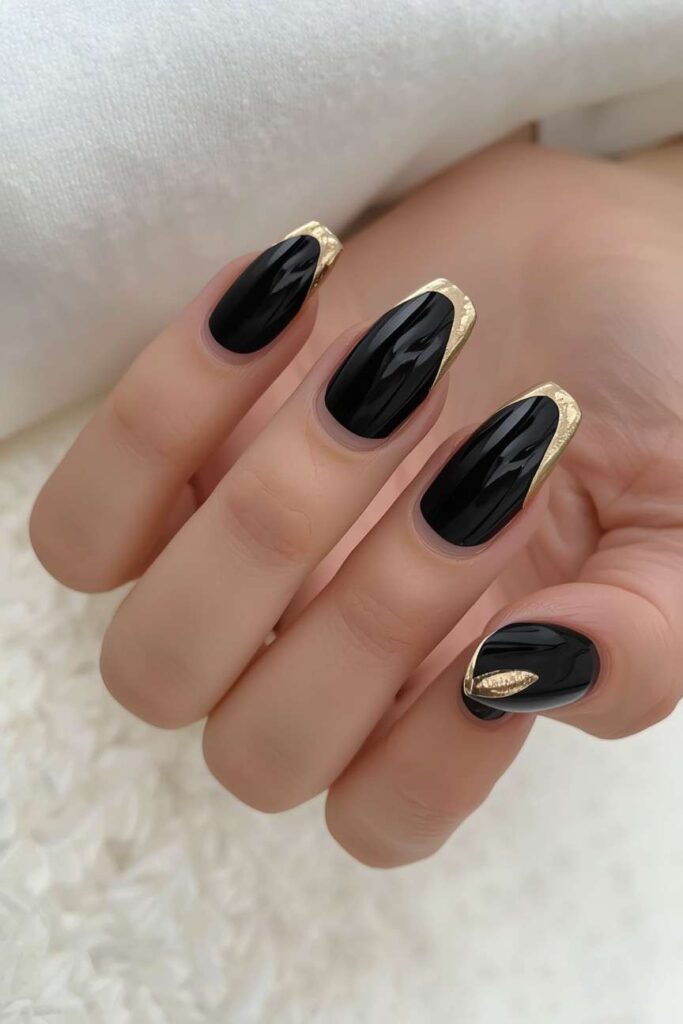 For those who love understated luxury, black nails with golden French tips strike the perfect balance between edgy and elegant. The gold shimmer adds warmth and sophistication, elevating your Halloween look. This design is ideal for evening events or anyone who prefers classy rather than costume-inspired nail art.