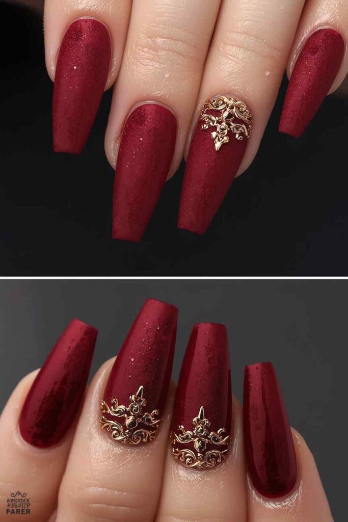 Channel your inner vamp with deep red velvet-textured nails. This plush look captures classic Halloween sensuality and refinement. You can add a glossy topcoat to some nails for variation, creating contrast between shine and matte. Perfect for dramatic Halloween ensembles or candlelit events.