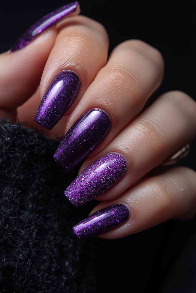 Incorporate deep purple tones with hints of shimmer or metallic sheen. The rich jewel tone mirrors elegance and mystery, perfect for Halloween festivities. Add a fine line of silver or gold at the base for an elevated finish. This design feels both regal and eerie, a true representation of Halloween glamour.