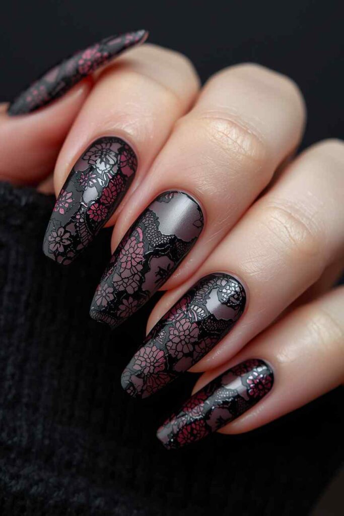 Combine femininity and darkness with a lace-inspired nail design. Use black or dark gray polish with intricate lace patterns drawn over a sheer nude base. This look feels sensual, refined, and hauntingly beautiful. Ideal for formal Halloween events, lace nails evoke the charm of vintage elegance and gothic romance in perfect harmony.