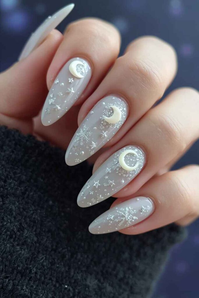 Capture the Halloween night sky with soft gray nails adorned with moon and star accents. Use metallic polish for celestial highlights. The dreamy blend of mystery and elegance makes this design perfect for night events, adding a subtle supernatural glow to your overall look.