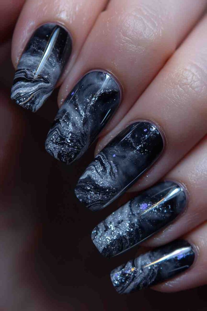A marble effect in shades of black, gray, and silver captures the beauty of a misty Halloween night. Each nail looks like a swirling piece of moonlit art. This ethereal design pairs perfectly with statement rings and gothic jewelry, exuding quiet luxury with a touch of mystique.